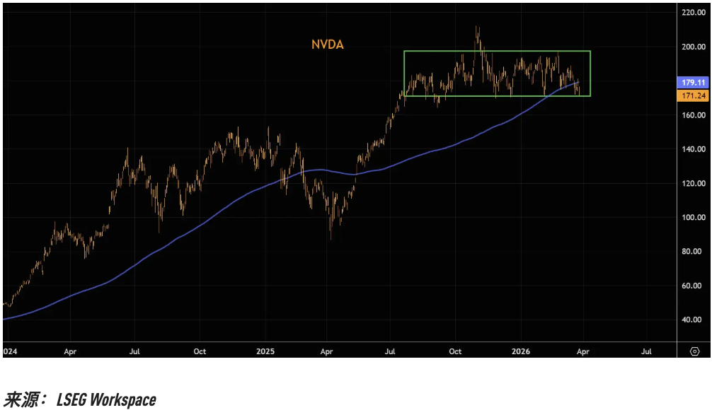 英伟达(NVDA)的走势呈现出一种异乎寻常的平静。自去年7月以来,该股基本被困于约25美元的窄幅区间内,近期刚刚收盘跌破200日均线,但目前来看,技术突破尚未触发明确的方向性信号。