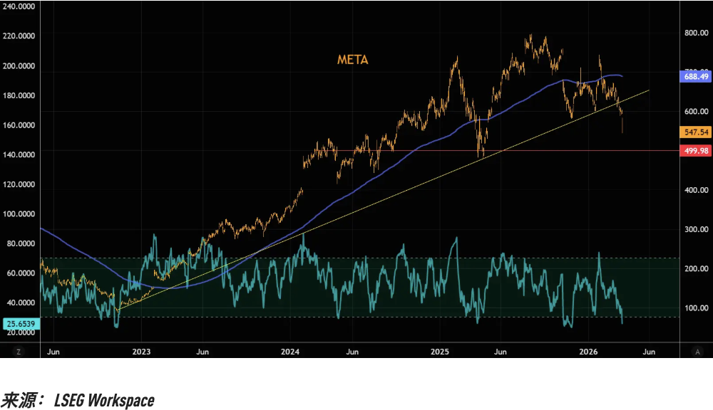 META本周早些时候跌破了一条主要上升趋势线,并在随后的交易日进一步加速下行。目前,该股收盘价位于200日均线下方的幅度,已是近期罕见。