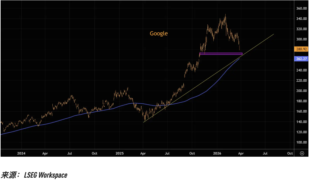谷歌母公司Alphabet(GOOG)历来是MAG 7中走势最为稳健的成员,但此轮调整已蔓延至这只"压舱石"。GOOG目前正逼近长期趋势线与200日均线的交汇区域,而该支撑带较当前股价仍低约15至20美元,能否守住尚存变数。