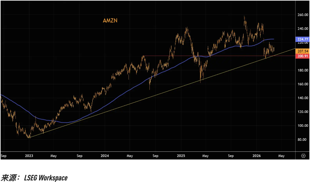 亚马逊(AMZN)的处境与之相似——股价自去年11月以来几乎原地踏步,持续在200日均线下方挣扎,但仍守在更长周期的趋势线之上,整体陷入两难的胶着状态。