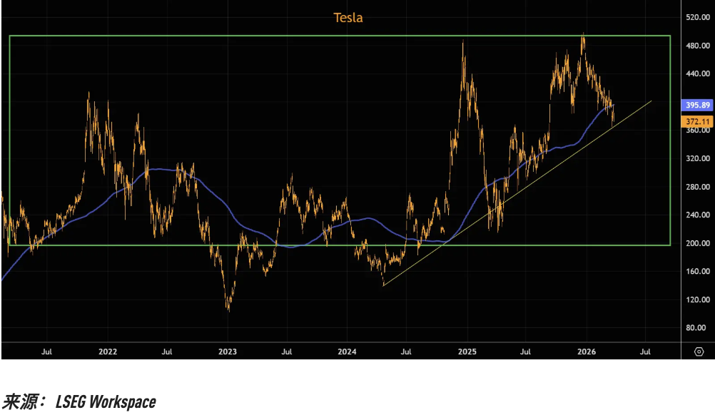 特斯拉(TSLA)则在一条关键趋势线附近徘徊,股价略低于200日均线。放大时间维度来看,特斯拉本质上多年来一直是一只无趋势的股票,长期在宽幅区间内震荡,目前点位已基本回到2021年底时的水平。