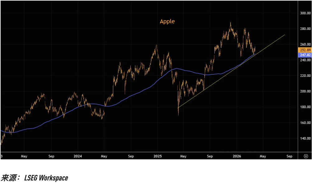 在七只成分股中,苹果是目前唯一走势相对抗跌的标的,市场将其归类为"反AI"逻辑的受益方向。自"解放日"(Liberation Day)低点延伸而来的上升趋势线,与200日均线在当前位置形成交汇,共同构成一个值得密切关注的关键支撑区域。