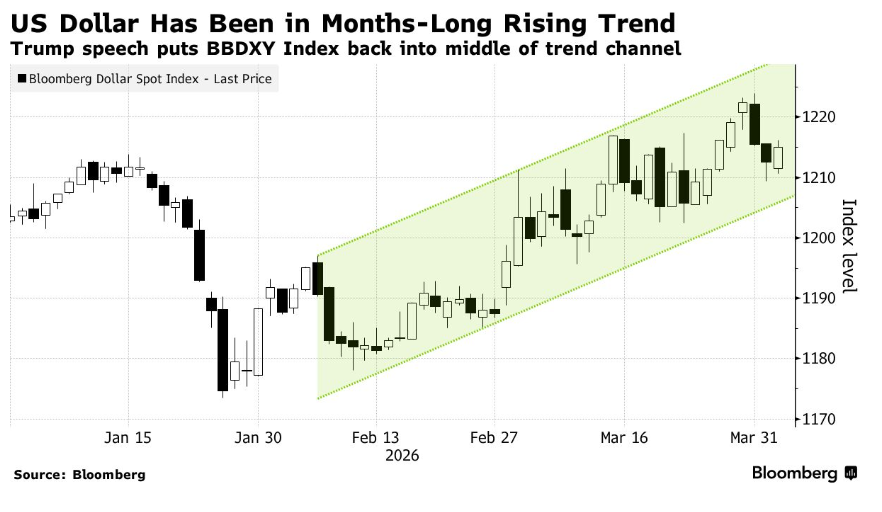 看起来,特朗普未能让市场相信战争将从此走向降级,也未能让市场相信美国将帮助确保霍尔木兹海峡的通行。现实情况是,美国军事实力仍在持续向该地区集结,这使得地面进攻的可能性依然存在。这意味着,短期内美元仍将持续受到买盘支撑。