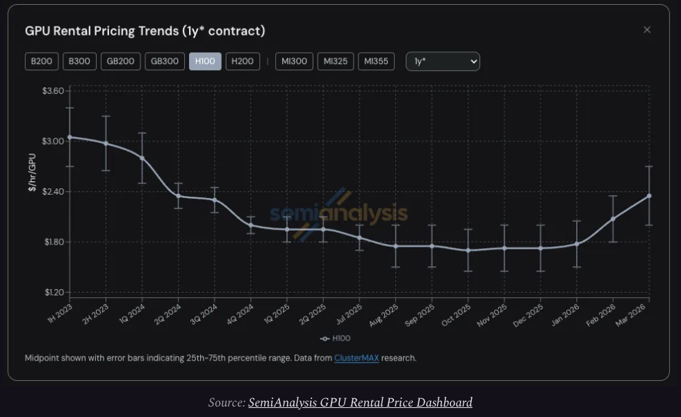 据研究机构SemiAnalysis最新报告,H100 GPU一年期租约合同价格已从2025年10月的低点每小时每GPU 1.70美元急升至2026年3月的2.35美元,涨幅接近40%。与此同时,按需算力已在所有GPU型号上全线售罄。