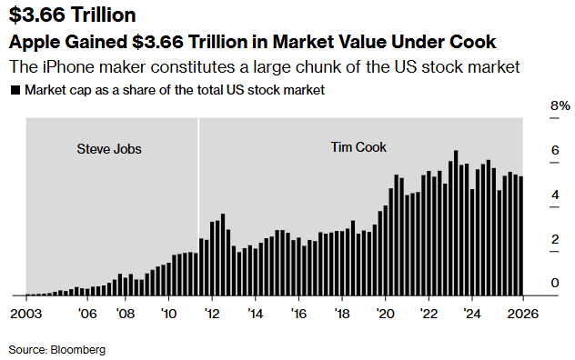 在接替史蒂夫·乔布斯 15 年后,蒂姆·库克正将苹果公司的最高领导权移交给硬件专家约翰·特努斯。这位即将卸任的首席执行官将留任执行董事长,他在任期内创造了前所未有的辉煌业绩。
