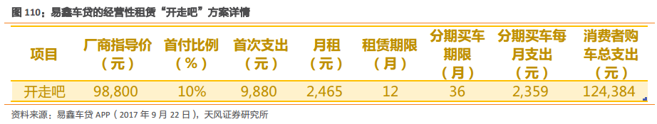经营性租赁以“开走吧”产品为代表。 通常来说, 消费者需要首次支付 10%的首付,并且在未来的 12 个月里支付一定额度(大致与贷款买车月供相同), 一年之后消费者既可以选择分期买车,或者也可以用相同的方案再开一年新车。对于易鑫车贷来说, 如果消费者选择换辆新车或者结束租赁,易鑫车贷就会把租赁车辆以二手车的形式拍卖或者出售