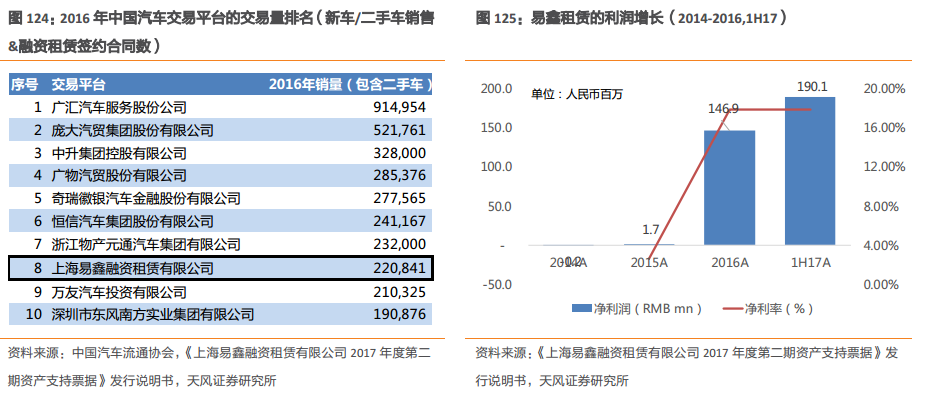 参考《上海易鑫融资租赁有限公司 2017年度第二期资产支持票据》发行说明书所披露的易鑫租赁直接债务融资计划,公司在 2017年下半年和 2018 年全年投放 140 亿和 336 亿左右,按车均 7 万元的平均贷款计算, 2H17和 18 年有望继续新增 20 万台次/48 万台次的车辆。 按易鑫租赁 1H17 新签合同 13.7 万份,以及上半年约占全年交易量的三分之一的预测, 17 年易鑫租赁有望成为中国第三大汽车交易平台。易鑫租赁 16 年实现 1.47 亿利润,较 15 年 167 万利润实现了快速增长,净利率提升 15.3百分点达到 17.9%。 17 年上半年实现净利润 1.9 亿元,净利率为 14.8%,未来有望随着收入规模的扩大和经营效率的提升持续提高