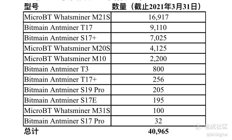 截止3月31日,公司拥有矿机40,965台,最大算力从2020年12月31日的2253 PH/S增加到2264.5 PH/S。公司矿机型号及数量详情如下: