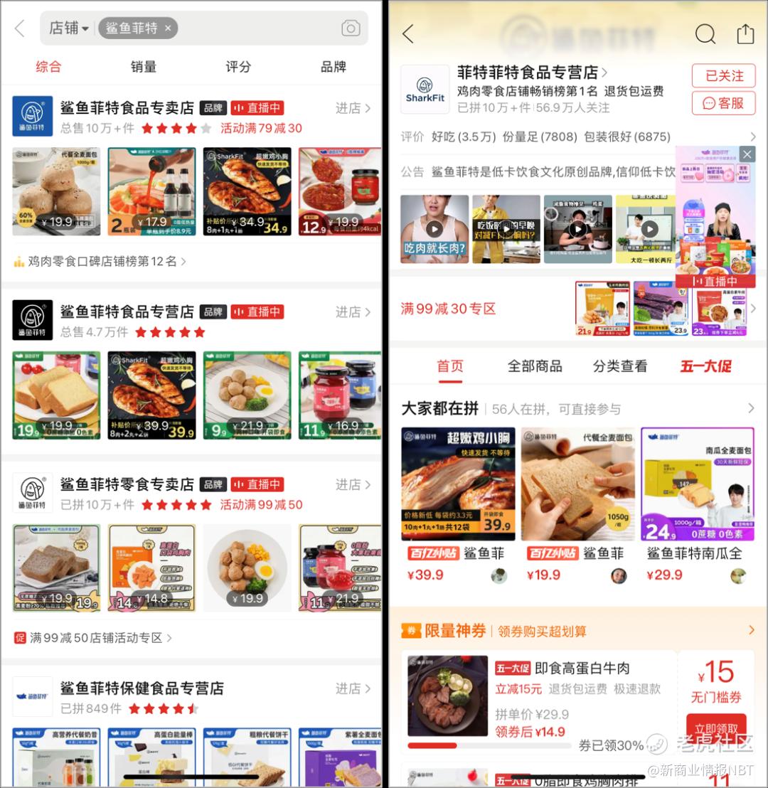 此外,店群也能帮助品牌获取更多公域流量。举个例子,鲨鱼菲特多个店铺的鸡胸肉销量都很高,当消费者搜索鸡胸肉时,鲨鱼菲特能占据更多靠前的搜索位置。