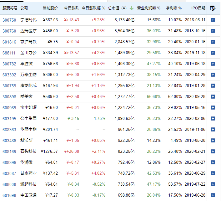 可以看到宁德时代,万泰生物,爱美客等新秀股票均名列其中。这些股票自上市以来的收益都十分可观。