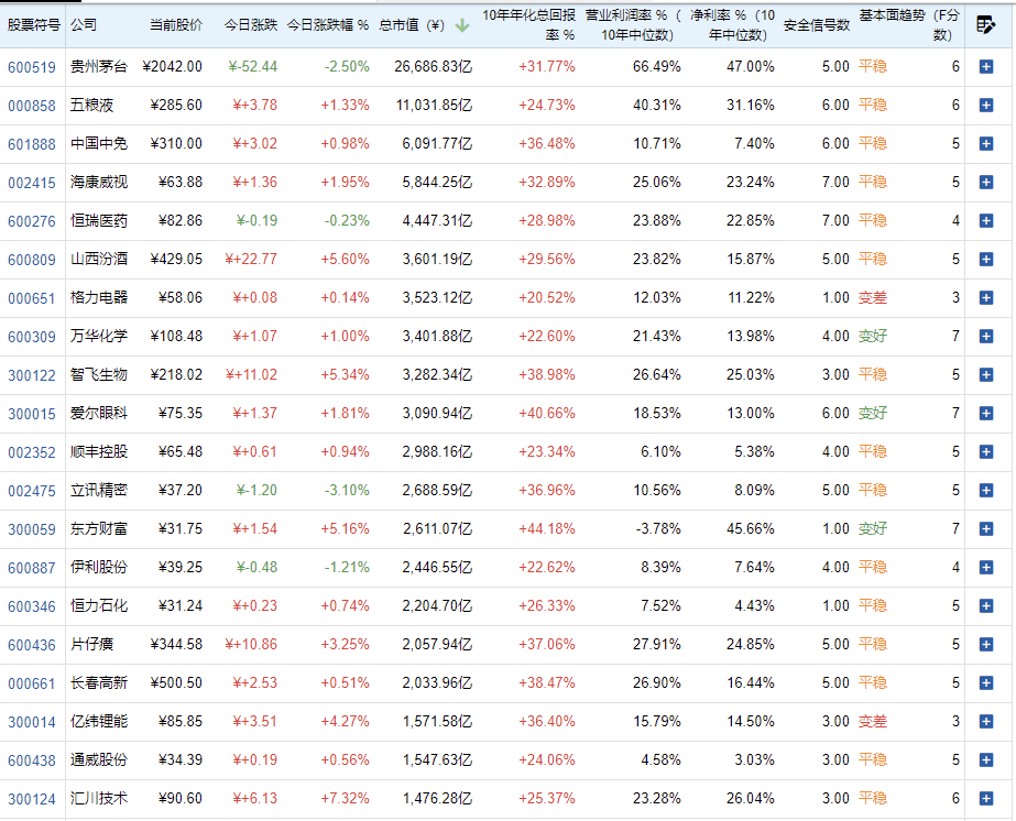 A股近10年增长较快的股票,几乎都是有强大的持续盈利能力的公司。若是按巴老1957到2018年之间年均复合收益率20%要求自己,使用价值大师中文站的全能筛选器功能,在A股**可筛选出72只股票。