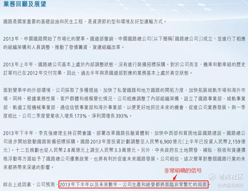我们来举个例子,大家可以看一下中车时代电气(03898.HK)2013年的中报。在财报中,中车时代电气表示2013年下半年及未来数年,公司生产及经营将面临非常繁忙的局面。