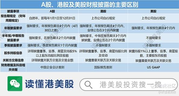 此外,关于财报披露时间,港美股和A股之间也有差异,给大家整理了一下,下面这个表比较清楚:
