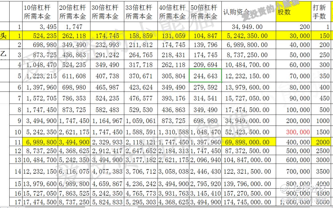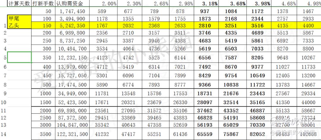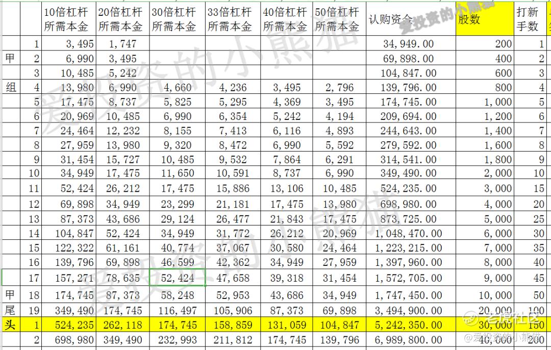 乙头20倍都要准备26.2万,加上利息27万。33倍就需要16万多就差不多了,乙组的认购方案需要的本金如下图: