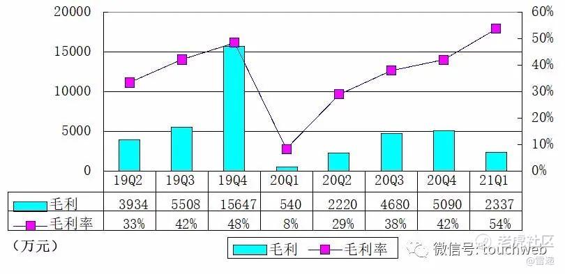 36氪2021年第一季毛利为2340万,毛利率为54%,上年同期毛利率为8%。