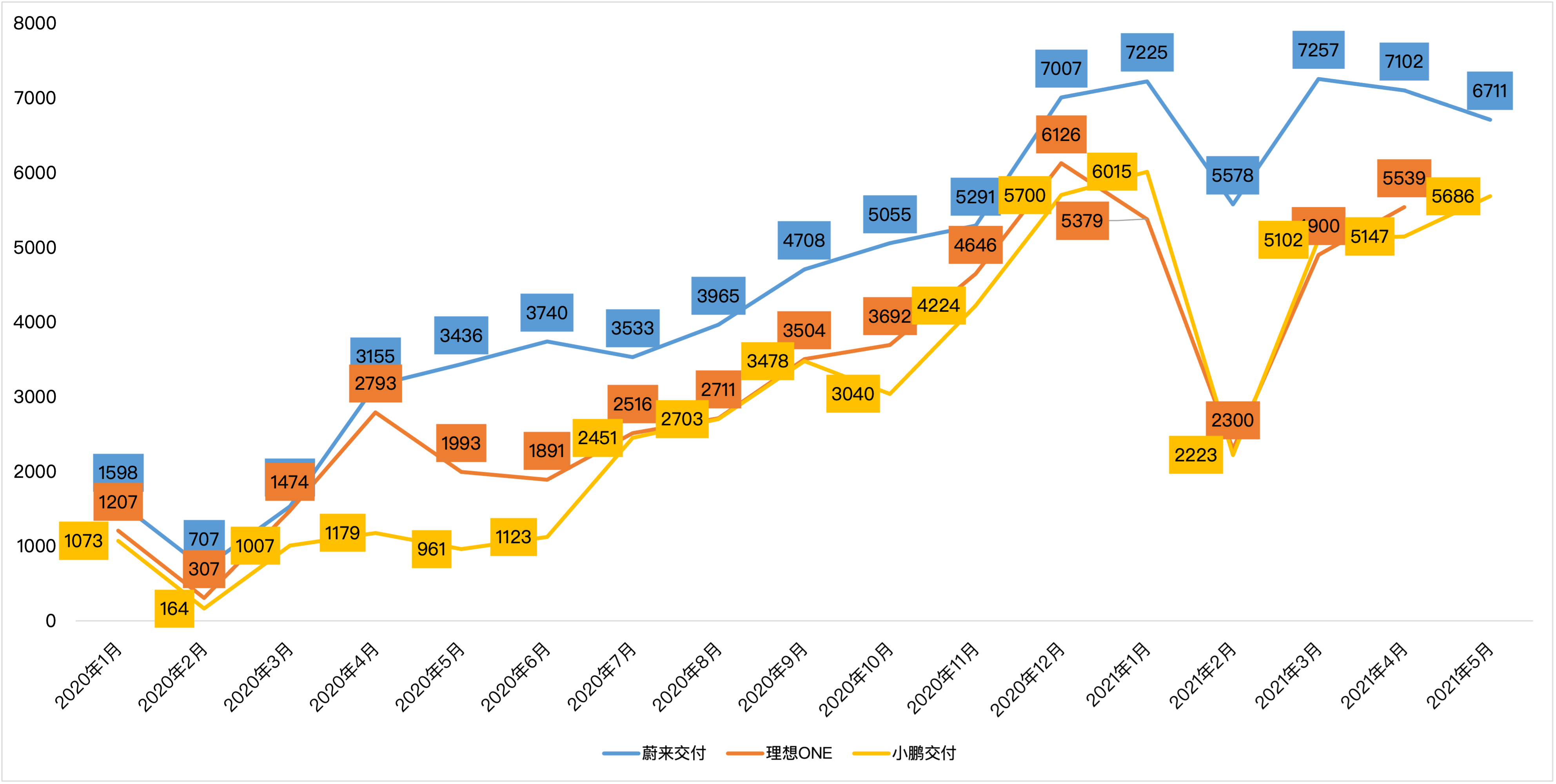 蔚来宣布5月共交付整车6711台,同比增长95.3%,环比减少5%。其中全新蔚来ES8交付1412台,蔚来ES6交付3017台,蔚来EC6交付2282台。截至5月底,累计交付109514台。因芯片带来的供应链波动及交付环节的调整,蔚来5月交付工作曾受短暂影响。蔚来新订单持续增长。根据最新的生产及交付计划,蔚来将在6月加快交付节奏,二季度交付量指引保持不变,为21000到22000台。$蔚来(NIO)$