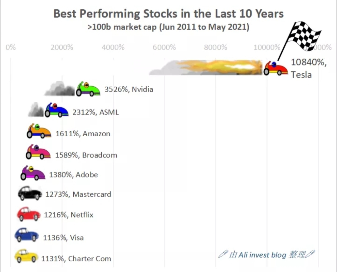 过去10年,大型股市值 (>$100b) 股价最佳表现的Top 10.