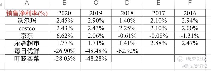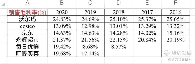 沃尔玛、Costco、京东、永辉超市与每日优鲜、叮咚买菜毛利率、净利率对比图: