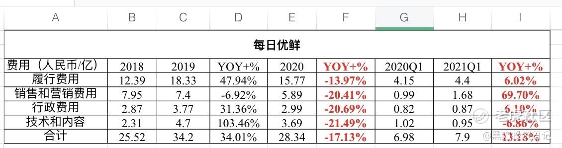 每日优鲜2018/2019/2020/2021Q1的收入成本分别为32.43亿/54.80亿/49.40亿/13.41亿,同比增长68.98%/-9.85%/13.74%。2020年出现收入小幅增长而成本下滑,应该是疫情期间生鲜涨价造成的,后面的毛利率变化会呈现出来这个特征。