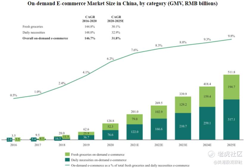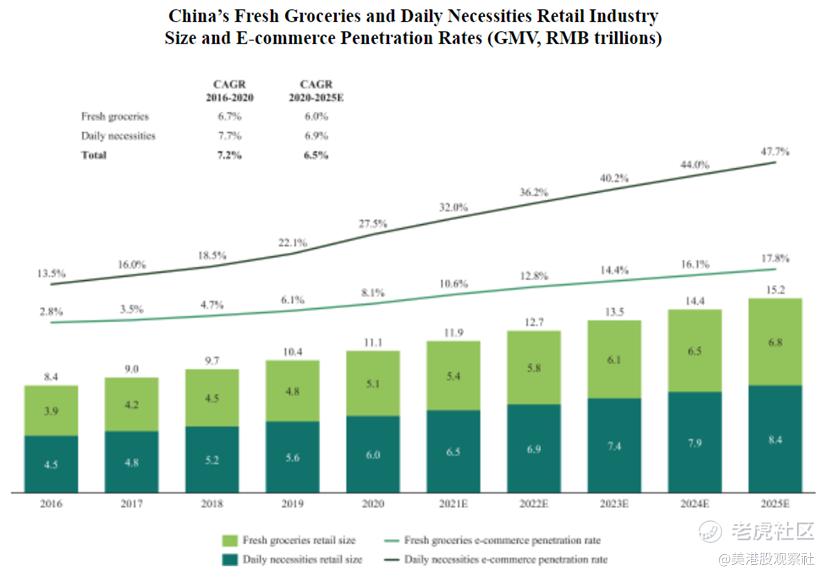 首先,中国的生鲜及日用品零售市场非常大,2020年生鲜零售市场5.1万亿元,日用品市场6万亿元,这两个市场加起来的市场规模为11.1万亿元。但是这两个市场的电商渗透率还不高,2020年生鲜市场的电商渗透率为27.5%,日用品电商的渗透率更低,只有8.1%。预计这两个市场未来规模继续扩大,并且电商渗透率提升。预计2025年生鲜零售规模为6.8万亿元,电商渗透率为47.7%;日用品零售规模为8.4万亿元,电商渗透率为17.8%。
