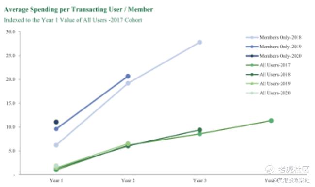 叮咚买菜的用户黏性也在不断增加,从下图可以看到,使用叮咚买菜越久的用户,在平台上的每单消费额越高,会员用户每单消费额更是普通用户的好几倍。2020年,每位会员平均每月的交易额从2019年的407元提升至478元。