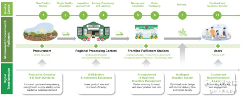 叮咚还搭建了自有全供应链,该供应链涵盖了生鲜产品的产出基地、区域处理中心、前置仓配送站,最后将商品快递给用户。用户只需在线上下单,很快就可以收到新鲜的商品。整个供应链通过自有的大数据和AI系统赋能进行链接,该系统累计了大量用户订单数据,以此深入挖掘用户的需求,进而,叮咚买菜可以向供应商更准确地订购商品数量,以及对到货的时间进行管理。