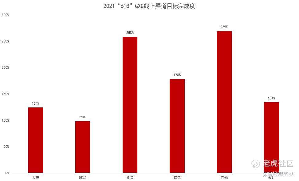 分渠道来看的话,GXG线上销售完成度达134%,规模同比增长了10%。其中天猫、唯品、抖音、京东及其他渠道目标完成度分别为124%、98%、258%、178%、269%,销量数据几乎是全面超预期。