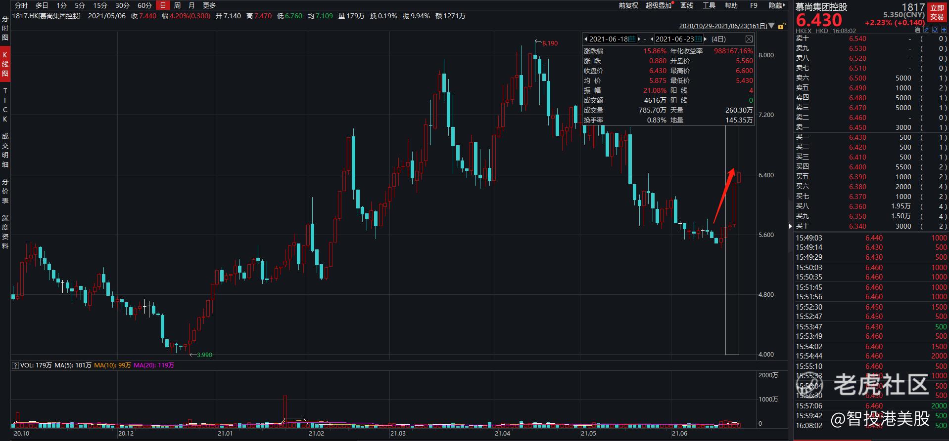 叠加此次618数据的进一步验证,$慕尚集团控股(01817)$ 成长逻辑已然更加清晰。而在二级市场方面,公司股价自6月18日开始,从底部盘整态势转为四连阳上行,累计涨幅达到了15.86%。