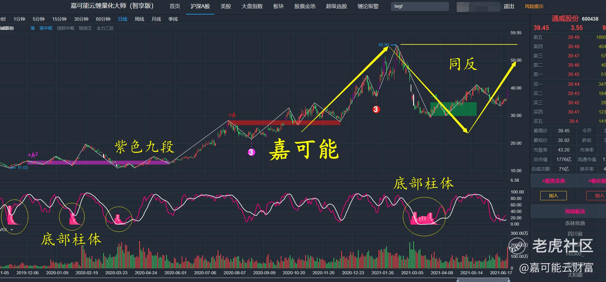 农林牧渔的通威股份(600438)似乎也是出现了历史性底部机会点,刚好走了一个缠论日线级别的同反(一种强势信号)如下图所示: