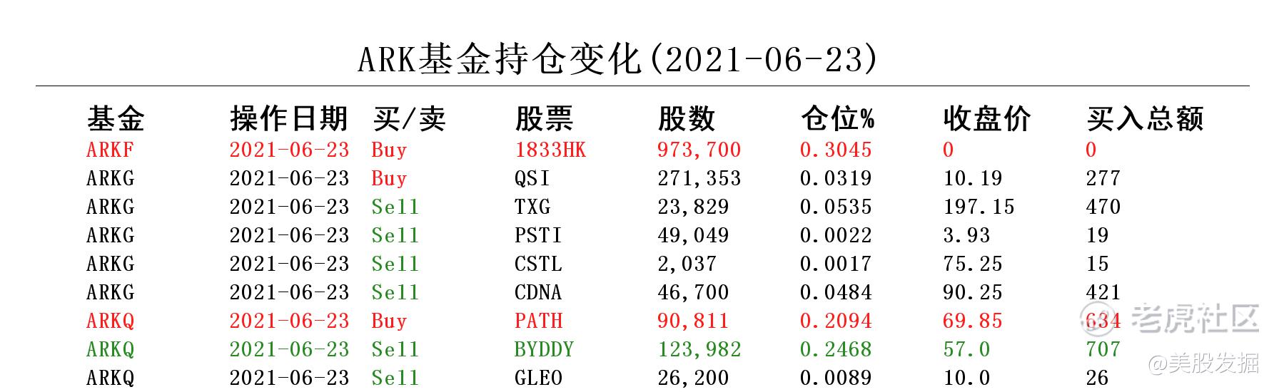 ARK基金2021-06-24持仓变化-买入平安好医生、path。卖出比亚迪