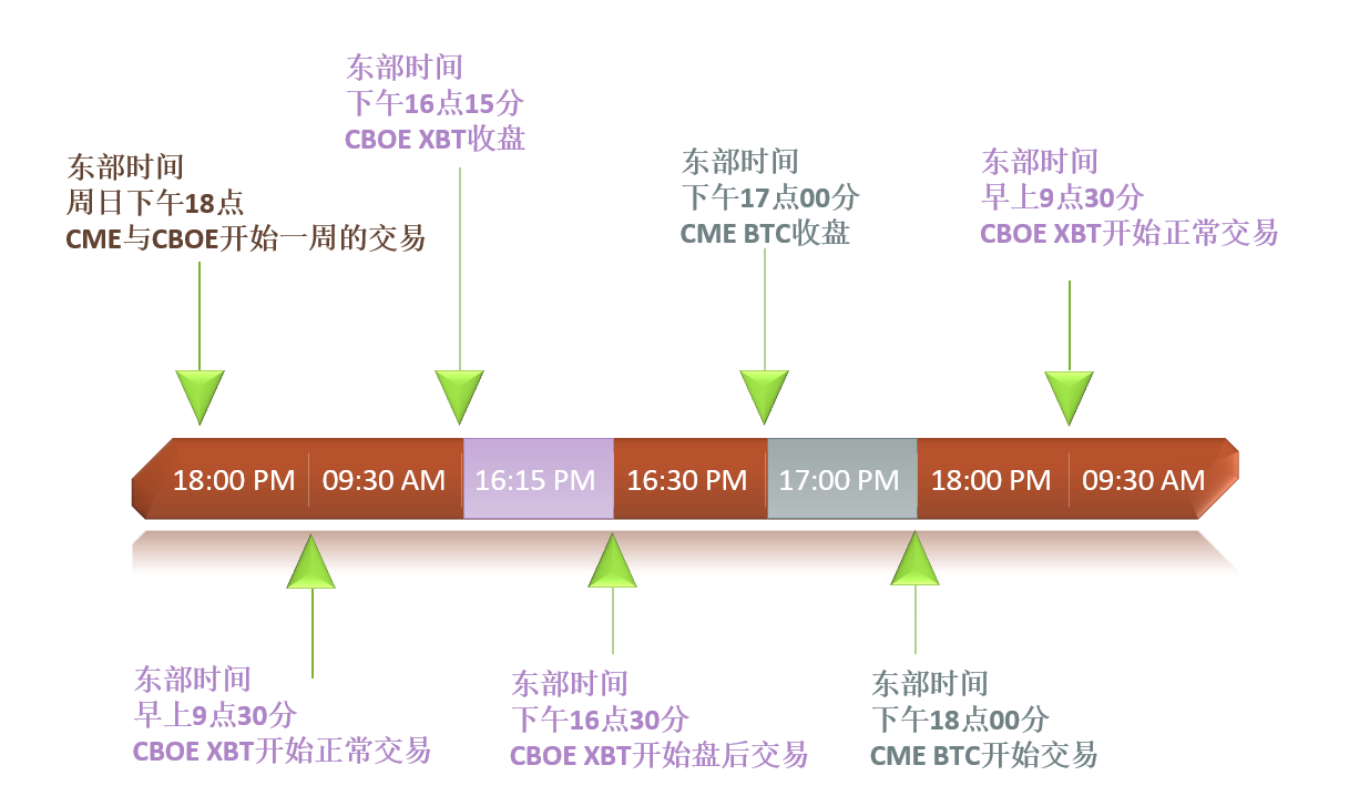 每天的正常交易时间为东部时间 9点30分至下午4点15分,盘后交易从周日下午6点开始,直到周一早上6点30分。其中,每天下午4点15分收盘后,将会休盘15分钟至4点30分重新开始交易 – 也就是说, CBOE的比特币期货可交易23小时45分钟!