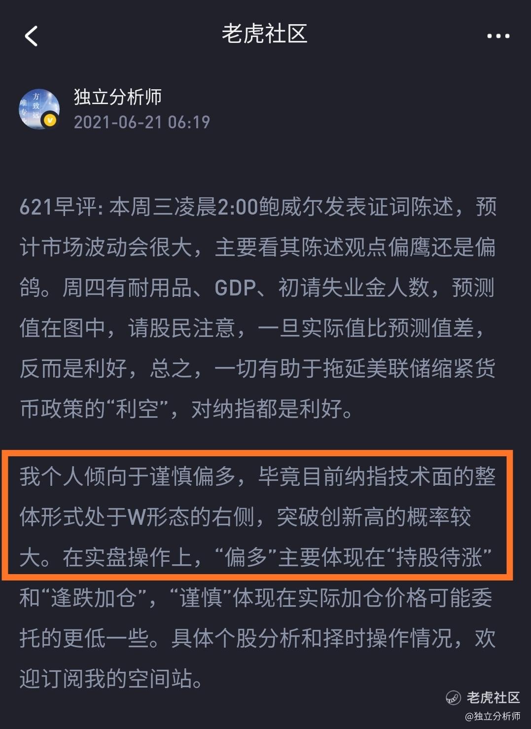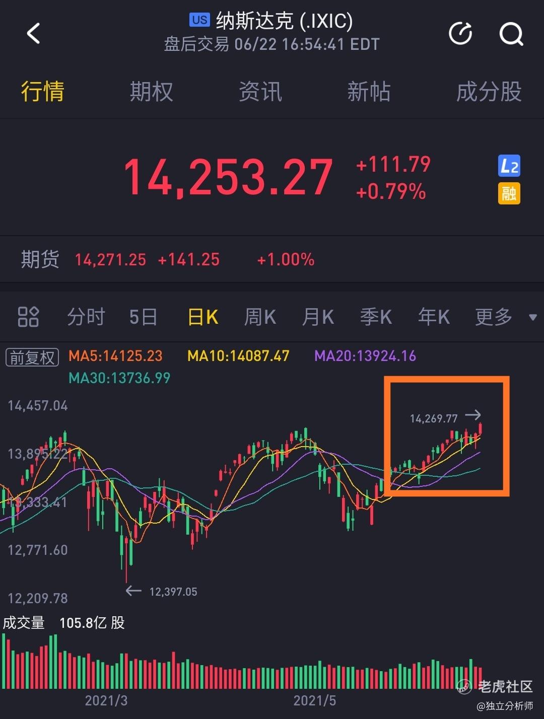 623早评:欢呼吧,所有华人美股股民应该干一杯。纳指与纳指100期货共创历史新高。正如我6月21日早评预期,“纳指技术面整体形式处于W形态的右侧,突破创新高的概率较大”(图一),在昨日实现了“突破创新高”。虽然昨日大股涨幅猛烈,小股涨幅小,甚至有回调,但不用担心,大股上涨提高了指数的估值,小股估值提升也会得到表现,前提是您买的股票基本面还凑合。