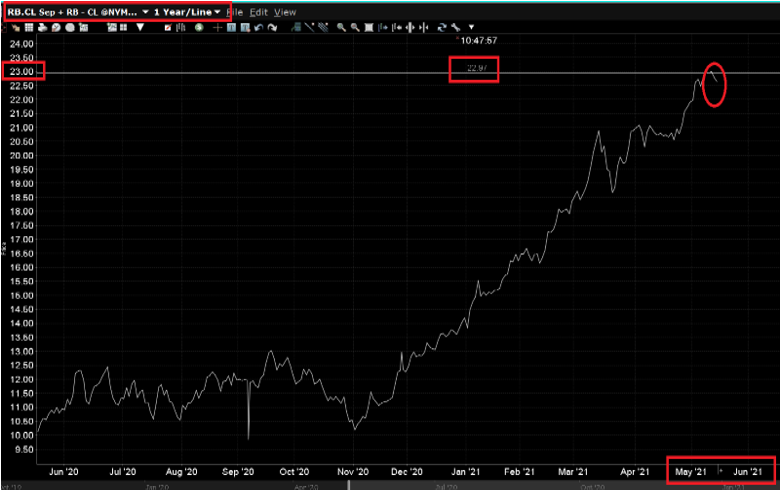 所以个人对整个夏季的交易策略仍然是逢低买入汽油和原油的裂解价差(RB.CL),请看下面一张图。