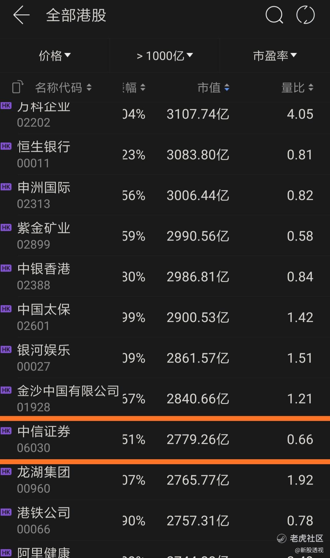 按照上述规则,京东物流要想快速纳入指数及港股通,需要首日收盘后的市值排名位于恒生综合指数的10%以内。目前恒生综合指数成份股有502支,市值排名前的10%即50支。恒生综合指数按市值排名第50支的成份股是中信证券2779亿。也就是说京东物流要想快速纳入指数,需要在首日收盘市值超过中信证券的2779亿。