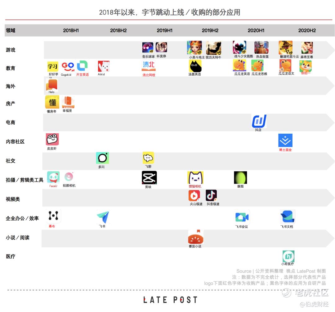 比如教育领域,目前有近 2 万员工。通过收购或自研,字节跳动两年时间内,将产品线扩充到了 20 多个产品,对学校和培训机构推出企业服务,针对学生提供培训,基本覆盖全年龄段全品类。
