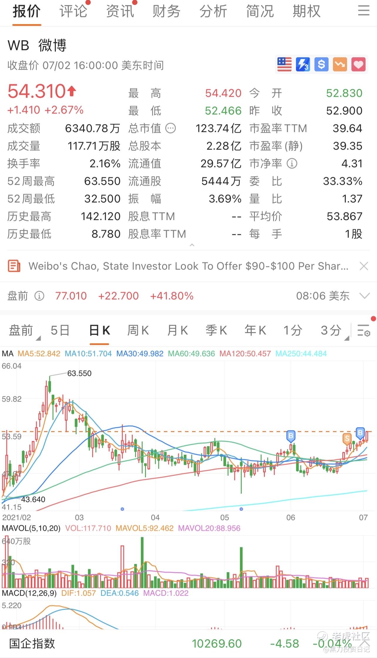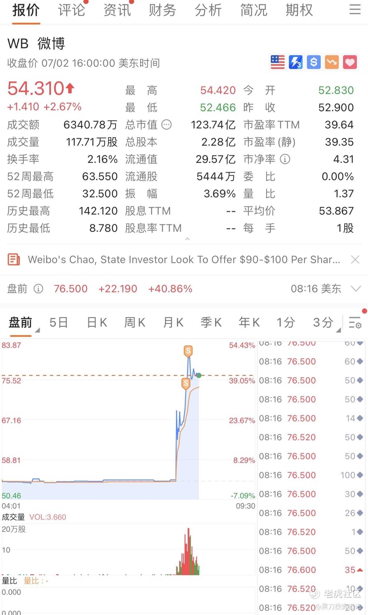 微博77块多走光了,主要考虑其实距离传闻90块的价格也比较接近,传闻未经证实,这部分价格就让给他了,而且我对这个价格本身不太相信,之前曹会计似乎有私有化微博的想法,价格比这个低得多,为啥我没有翻手做空,因为我现在几乎从不做空。在我的职业生涯中,有无数次放弃一部分利润提前走的经历,结果是有的很秀,有的卖飞,但总体都是赚的,大家自己领会,不要模仿,我也需要继续完善自己的投资能力。