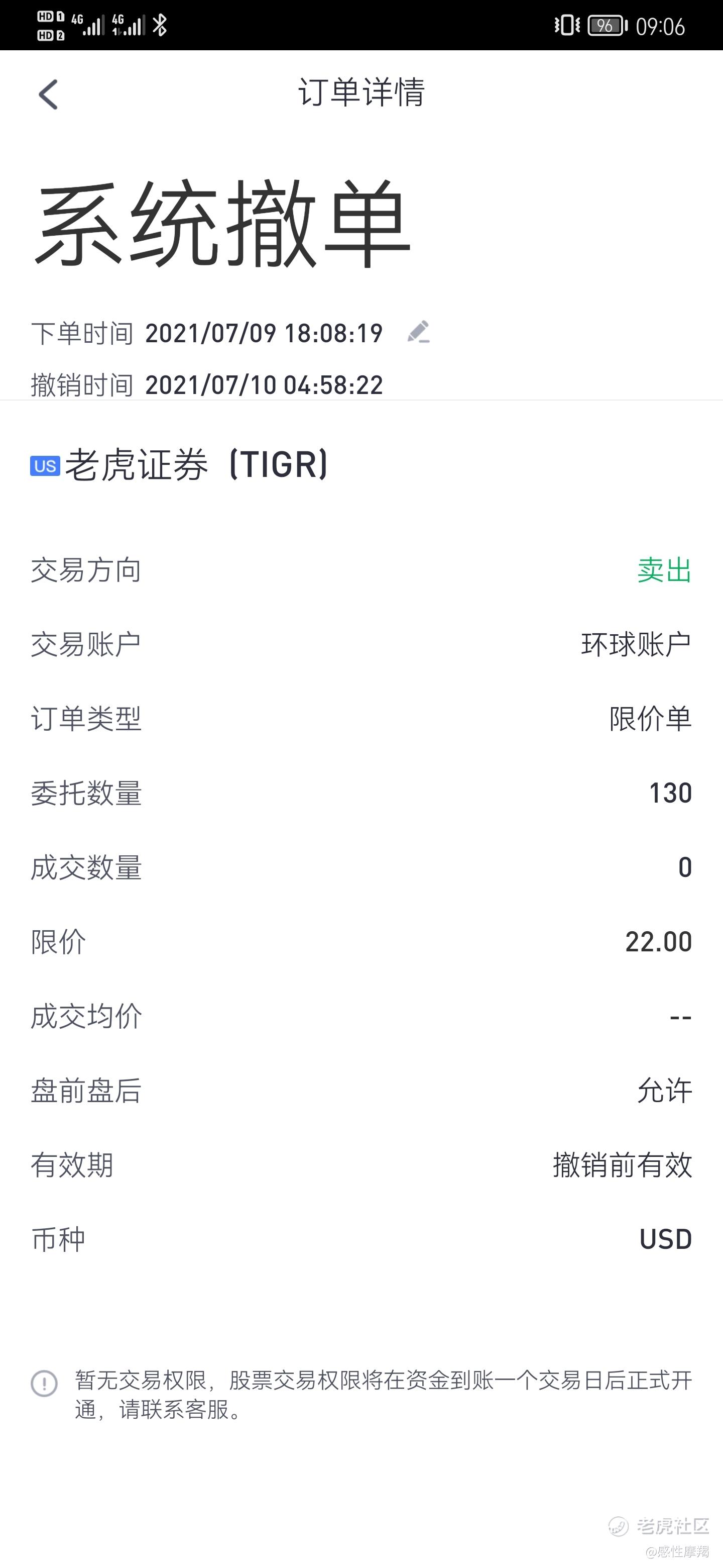 今天早上打开老虎证券突然发现所有挂单都没了,我还以为是网络问题,后来发现全部被系统给撤单了,提示:暂无交易权限,股票交易权限将在资金到账一个交易日后自动开通,这是啥意思,有人知道吗。因为是非交易时间,竟然没有人工客服,只能在这里发帖问了