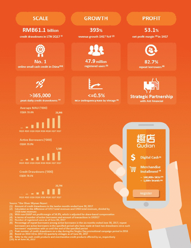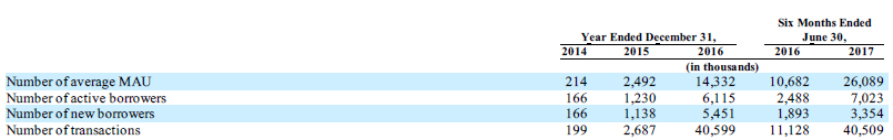 Ø 2017年上半年趣店的注册用户数突破4790万人;累计通过信贷审核人数1760万人;累计借款人数1010万人;2017年上半年平均月活跃用户数2610万,上年同期为1070万;