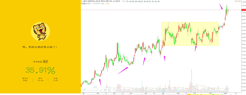 长期持有的中概股教育板块,经过多次仓位调整后整体价格也都上移一些,股价突破高位区间获得支撑;教育行业在国内市场发展稳定,业绩增长和招生人数的增长足以支撑目前估值,品牌优势和规模效应在国内处于领先,随着行业竞争压力扩大,业绩增长预期有所放缓,后市关注扩张进度和生源数量。