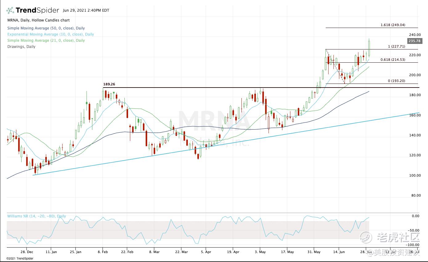 Moderna 是一支大体可靠但不太稳定的股票,走势服从技术面,但也经常让人感到无所适从。比如支撑位在100美元,它可能会在突破之前跌到97美元。或者没有重新试探189美元附近的主要突破水平,而是在193美元见底,并在投资者有机会做多之前冲上200美元。