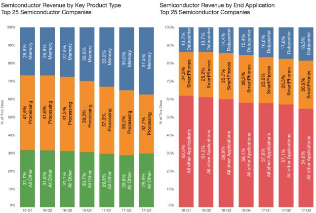 当前,半导体行业最引人注目的产品就是存储器。增长率从低于半导体均值的27%到超出均值37%。主要因素是价格大涨。从市场角度来看,存储器的主要推动力是智能手机与数据中心,特别是超大规模云数据中心。单纯价格上涨导致的增长,会在将来某个时间点反转,价格终会回落。