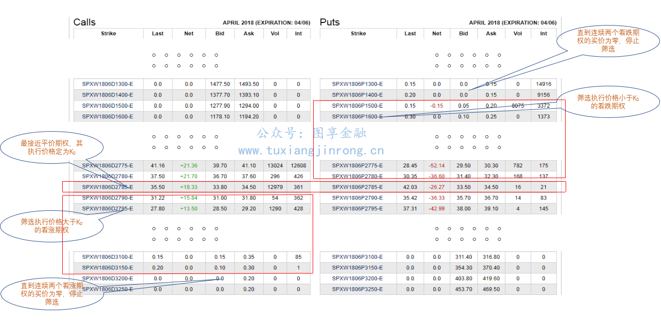 我从最新的SPX期权链中摘取到期日为2018年4月6号的数据,给大家图示公式里的几个关键参数,要完整的理解公式还是仔细看CBOE官网的解释吧。