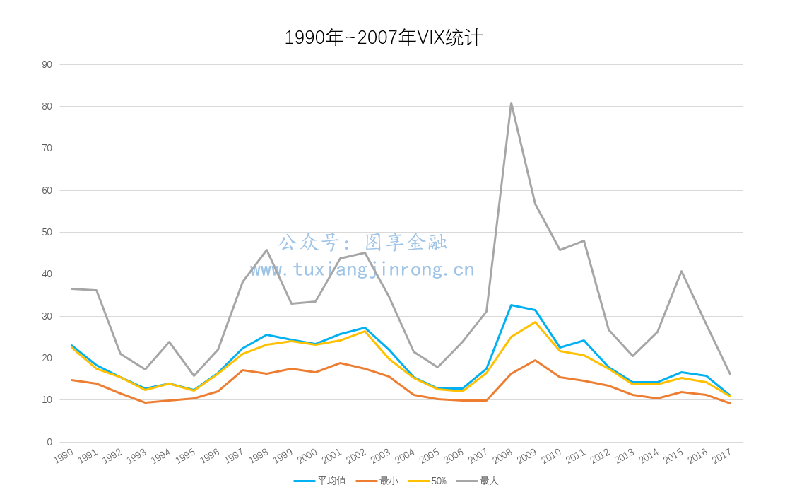 以年为单位,统计VIX指数的平均值,中位数,及最大最小值,图中蓝线即是VIX平均值,黄线则是中位数。这两条线基本上在20上下起伏,而我们观察美股这九年牛市中VIX的表现,均值呈现逐年下降的趋势,且波动越来越小,2017年的VIX指数的标准差也只有1.36而已。