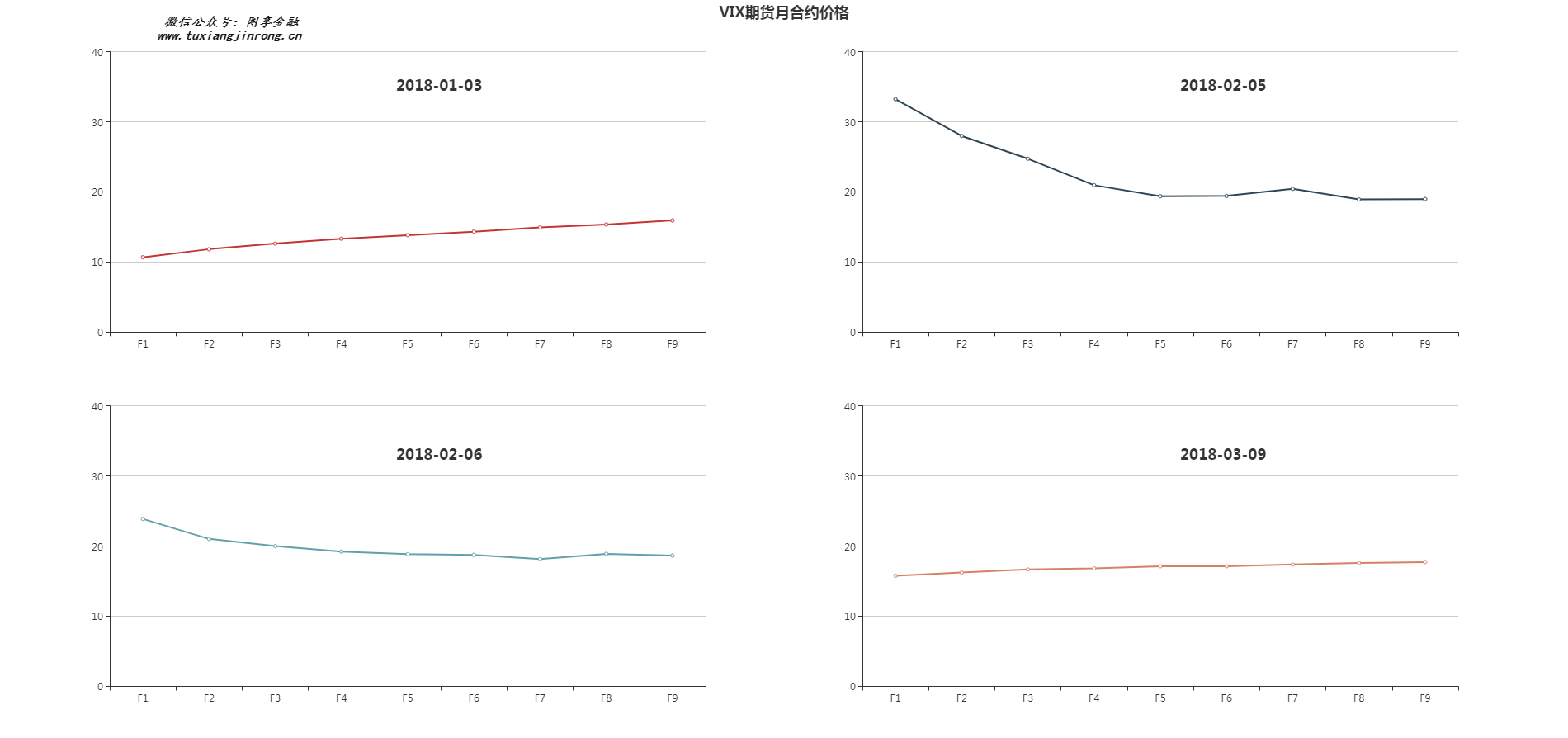 各个坐标中第一个数是当日收盘时的VIX指数,M1~M9是9个月合约的价格。从展期结构中我们可以看出,当VIX低的时候,市场对未来的期望值会逐渐抬高;当VIX在高位的时候,比如2月5号和6号,市场展望未来,认为VIX将逐渐降低到历史均值附近。