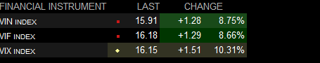 先补充第二篇里关于VIN,VIF的说法,这两个分别是近月期权和次月期权的波动率。大家如果去国外的财经网站查看这几个指数,比如在finance.yahoo.com,需要搜索^VIX,^VIN,^VIF,(其它门户网站上代码可能不一样),信息都是延迟15分钟的。我在盈透的账户里,订阅了OPRA(美国期权交易)的数据,所以能够得到VIN和VIF的实时数据。下图是盈透软件的截图,有红色原点表明是实时数据,黄色原点是延迟15分钟的数据。VIX的值一定是介于VIN和VIF之间的,借助VIN和VIF可以比整个市场快15分钟了解标普500的波动率。订阅全美期权交易数据每月只要1.5每元,如果月交易额超过20美元,这个费用自动免除。