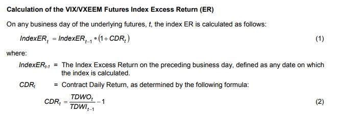 把公式移项后,我们看到这样一个场景:每个交易日,VIX近月期货(第一月)和次月期货(第二月)的组合涨幅是多少,ER涨幅就是多少;同样的,组合跌幅是多少,ER跌幅也是多少。