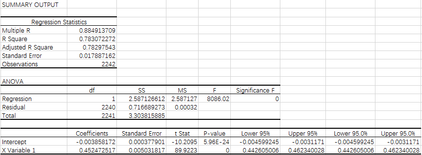 还记得初中数学里一次函数 y = kx + b 吗?随手做了下回归分析,VXX chng% = VIX chng% * 0.45247 - 0.3858%