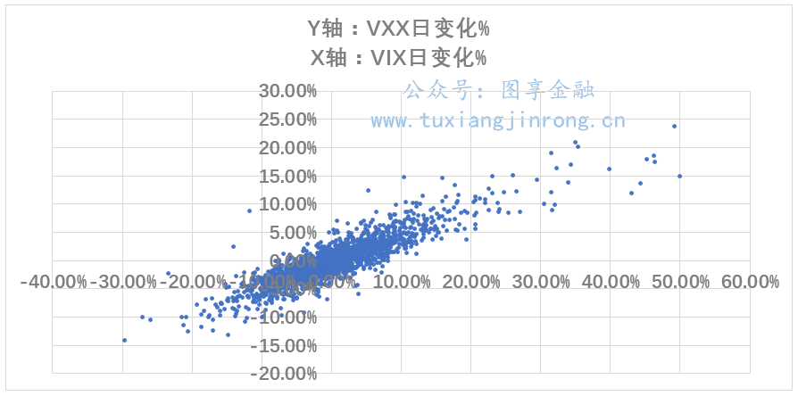 说到这里,其实还是蒙圈,我们又不盯着VIX期货看啊,而且这个组合还要计算,你说了不是白说?好,跳过中间公式推导和分析,我整理了09年1月30号到17年12月22号的历史数据,把每日VIX的变化百分比作为横轴,VXX的变化百分比作为纵轴,大家看到什么?