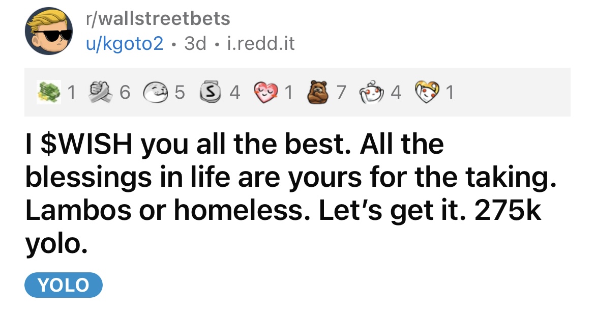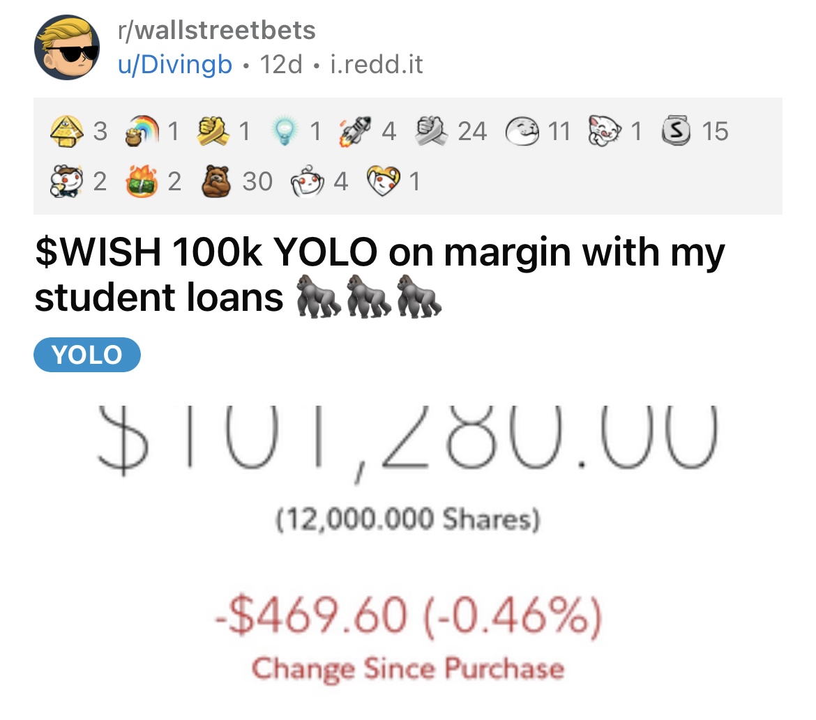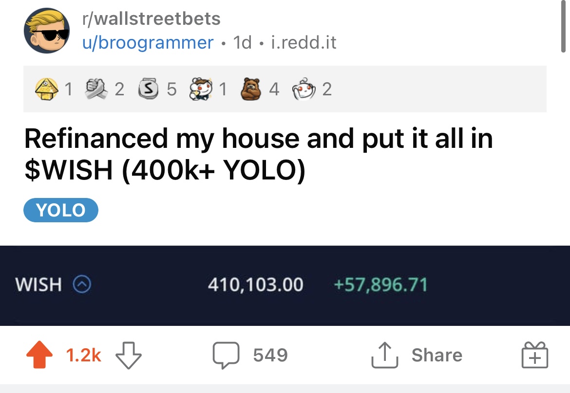 第一个叫Broogrammer的哥们把房子拿去抵押贷款换了40万美金,ALL IN (一次性押上所有,放手一搏)进了 $ContextLogic Inc.(WISH)$ 。 YOLO 是 "you only live once"的缩写,是时下美国年轻人奉行的及时行乐主义,这一概念在WSB群体里中尤为盛行。
