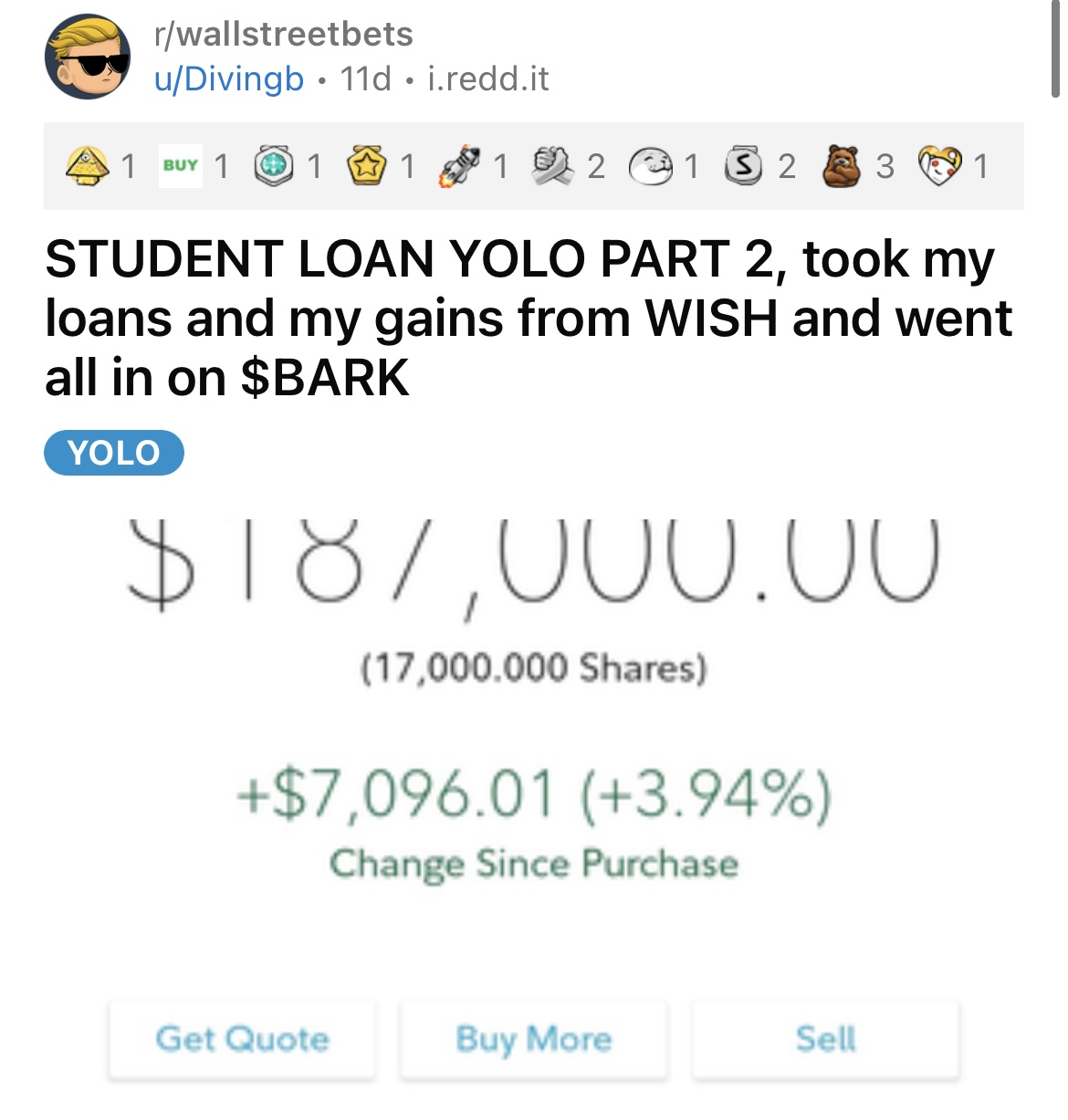 最夸张的是这个叫Divingb的小伙伴,在12天前把他的10万美金学生贷款放进了$ContextLogic Inc.(WISH)$,如果我记得没错的话6月9号是WISH涨上去最高位的时候啊,真的是为他捏一把汗。